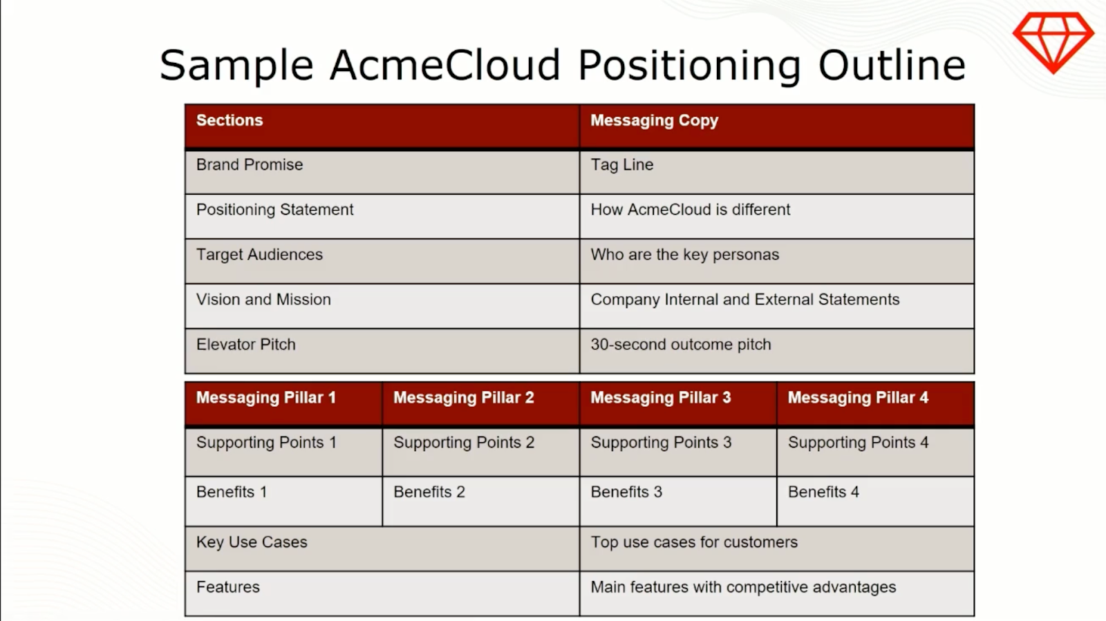 From here, you can build your messaging pillars. Your marketing team needs to be able to tease apart each of these pillars and use them to run campaigns that will hit different target audiences, so give them options.
