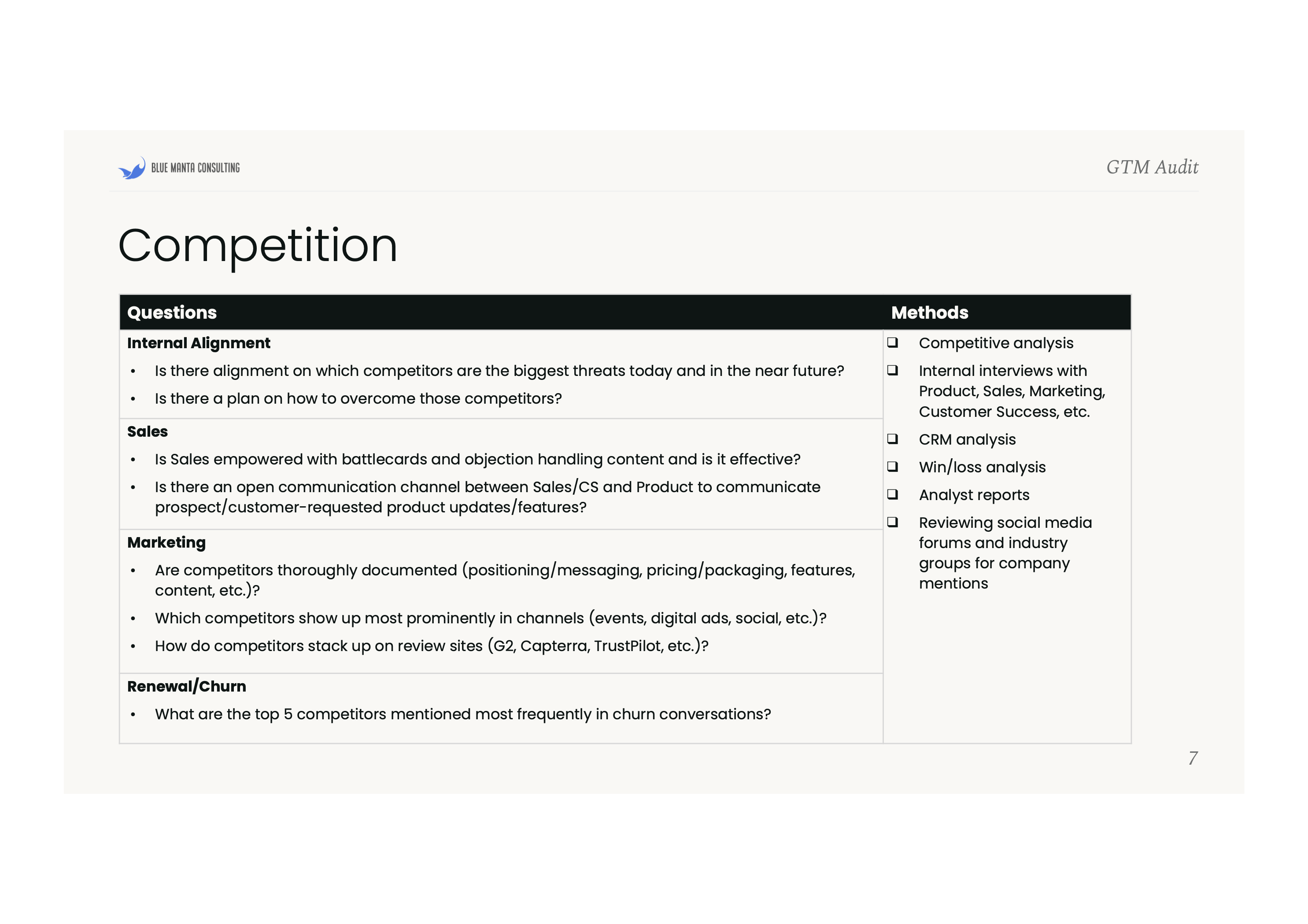 When it comes to competitors, consider evaluating whether there’s internal alignment on which competitors pose the greatest threat (today and in the future), along with whether there’s an effective method to mitigate those competitors, and if there’s open communication between internal teams on competitors.