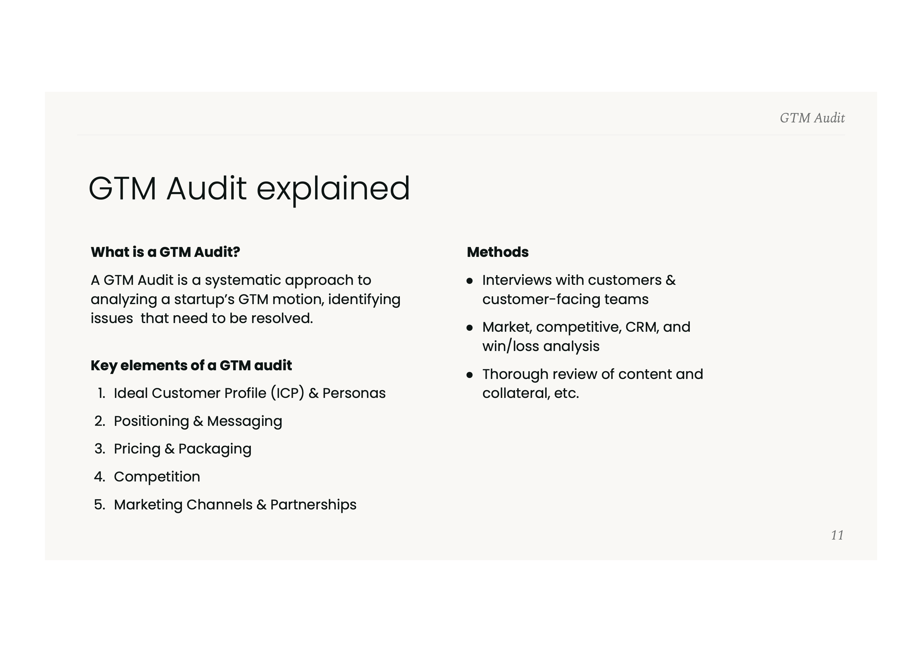 - Evaluating positioning and messaging and how they appear across your startup’s pitch deck, sales collateral, website, and SDR outreach.