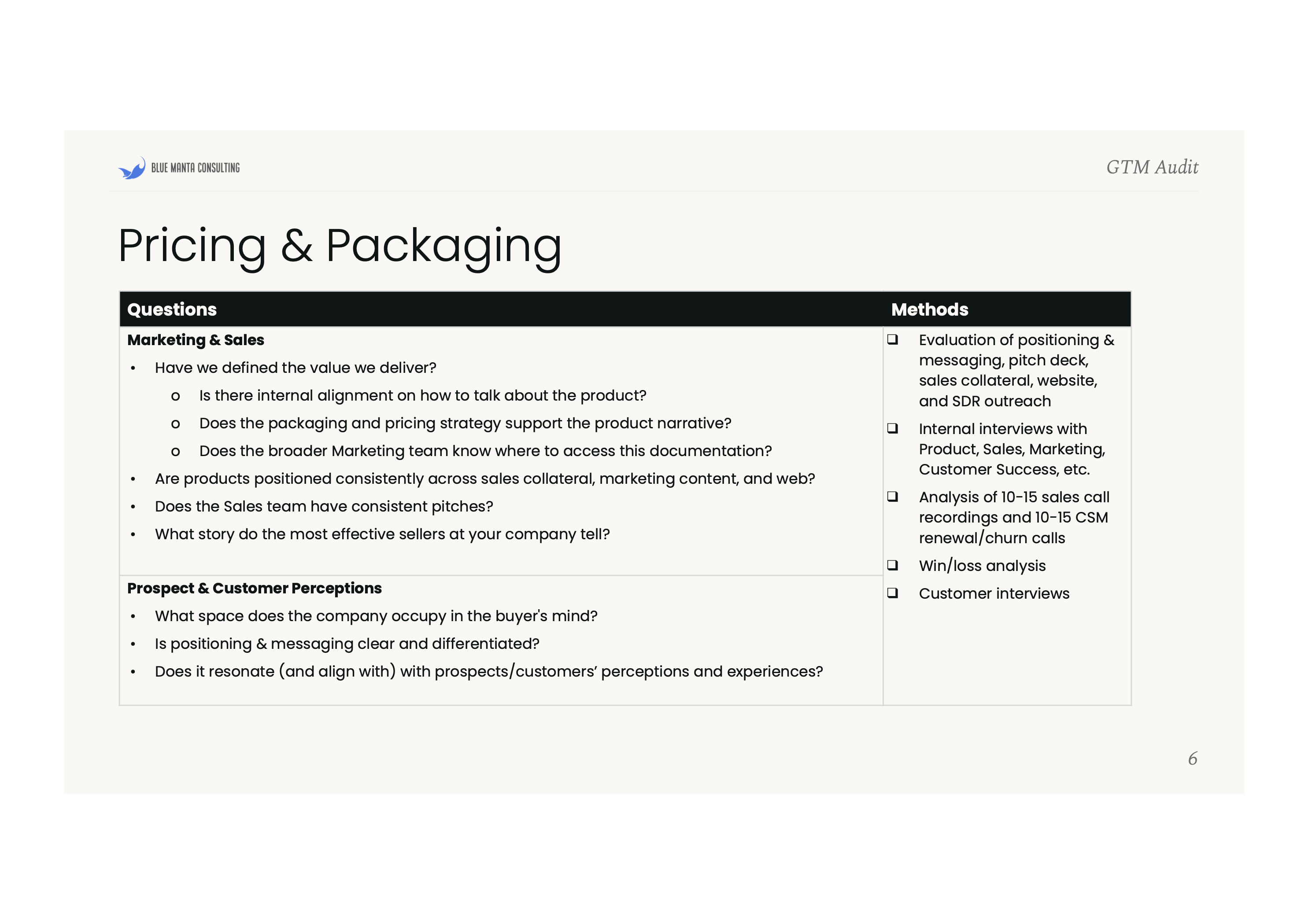 Just like with positioning & messaging, I like to start by understanding whether prices, packages, and discounts are documented, and if there’s internal alignment. I also recommend digging into whether value correlates as expected.